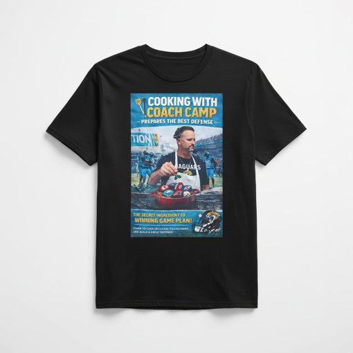 The genius of this shirt lies in its tongue-in-cheek metaphors. Famously spotted on Jaguars safety Antonio Johnson, the design reimagines defensive preparation as a gourmet recipe. The central image shows Coach Campanile in a cooking apron, trading his playbook for a spatula as he “seasons” a pot filled with the footballs of rival teams. Accompanied by the bold headline, “Cooking With Coach Camp Prepares the Best Defense,” and the tagline, “The Secret Ingredient to a Winning Game Plan,” it’s a brilliant nod to the grit and creativity required to build an elite defense. It’s more than a shirt; it’s a visual representation of coaching as an art form.