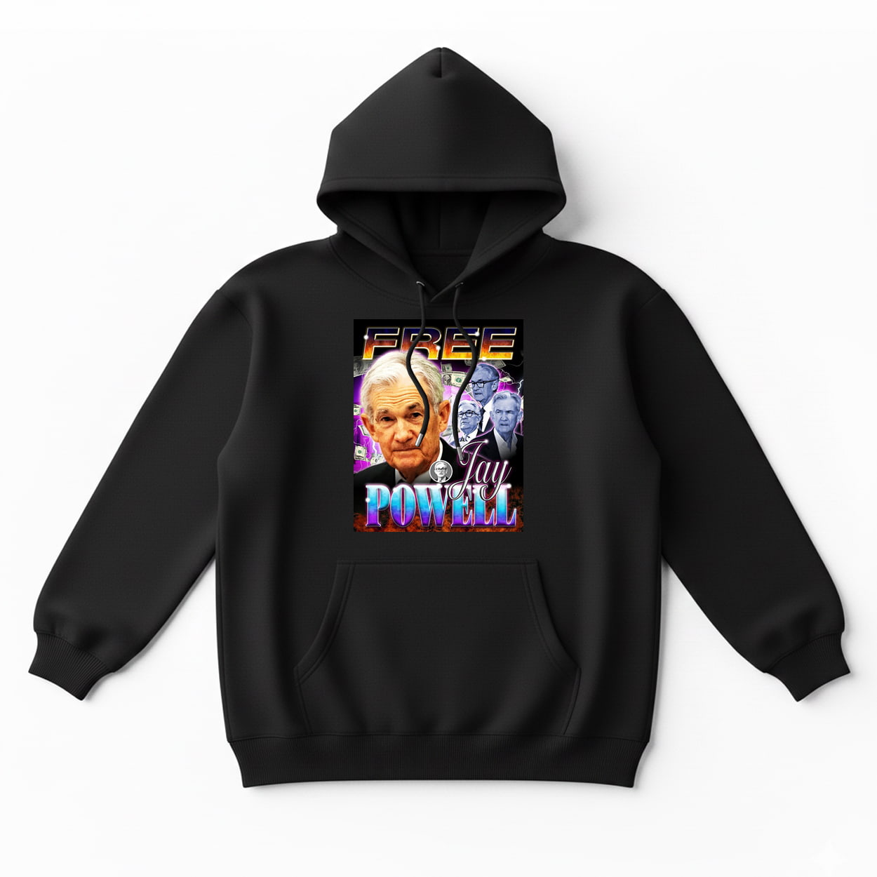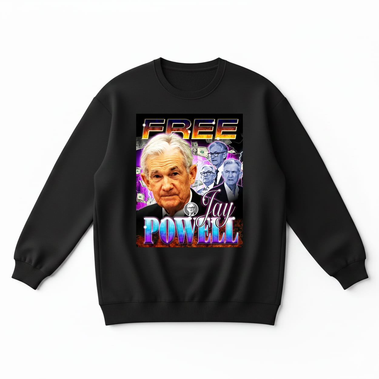 The shirt features a multi-layered collage of Federal Reserve Chairman Jerome Powell, rendered in high-contrast tones. Topped with a metallic, gradient-heavy “FREE” and anchored by a vibrant, chrome-styled “POWELL,” the design is electrified by bolts of purple lightning and fluttering banknotes. It is a visual representation of the “Free Jay Powell” movementâchaotic, energetic, and impossible to ignore.