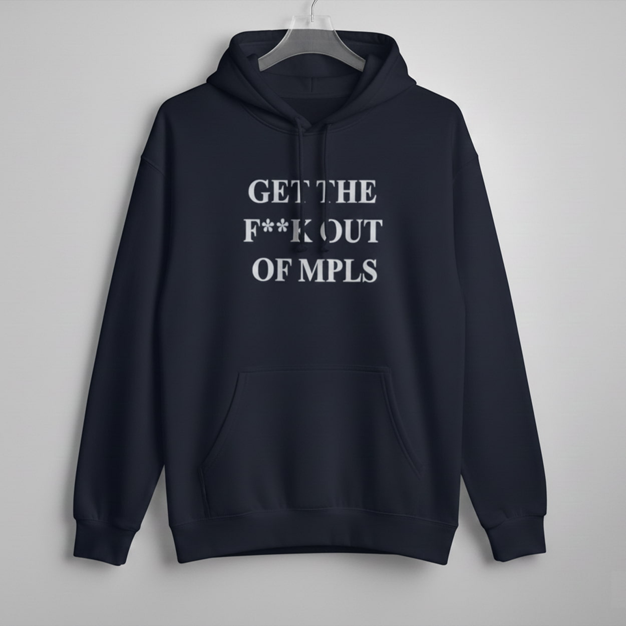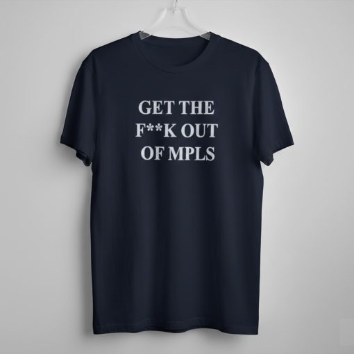This shirt features a minimalist yet high-impact design that captures a legendary moment in modern political pop culture. Set against a deep, classic navy blue background, the bold, white serif lettering reads âGET THE F**K OUT OF MPLS.â The use of playful asterisks in the center provides just enough censorship to keep it clever while ensuring the message remains crystal clear to everyone you pass.